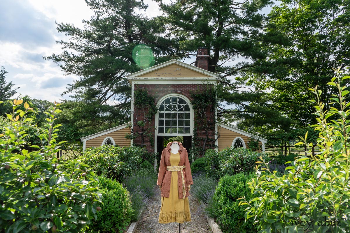 Gabled Duster Coat in Sunnyside Washed Plaid; Idyll Brooch in Rose Garden Silk Weaves; Gabled Frock in Yellow Days Washed Stretch Weave. Ivey Abitz at Boscobel House and Gardens