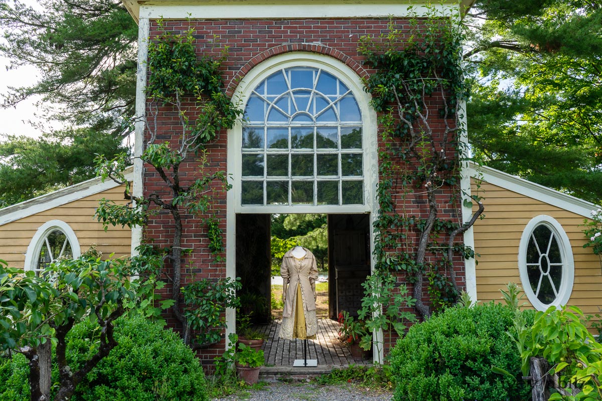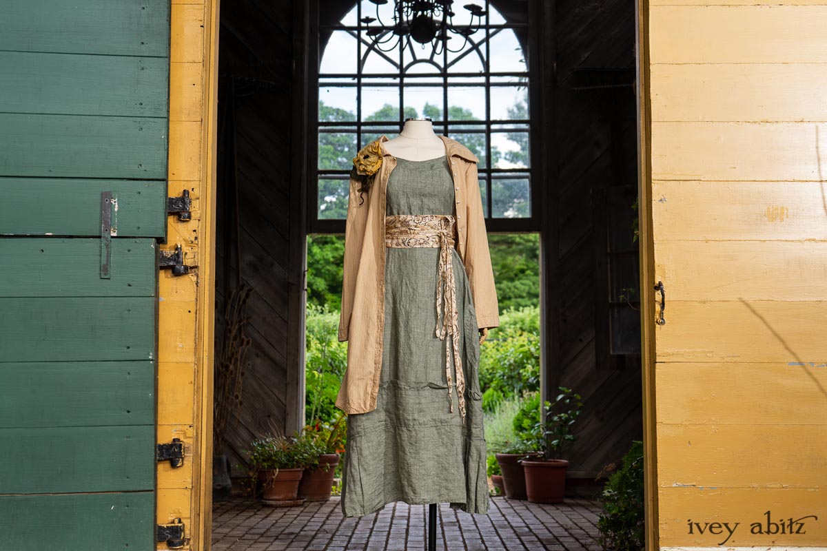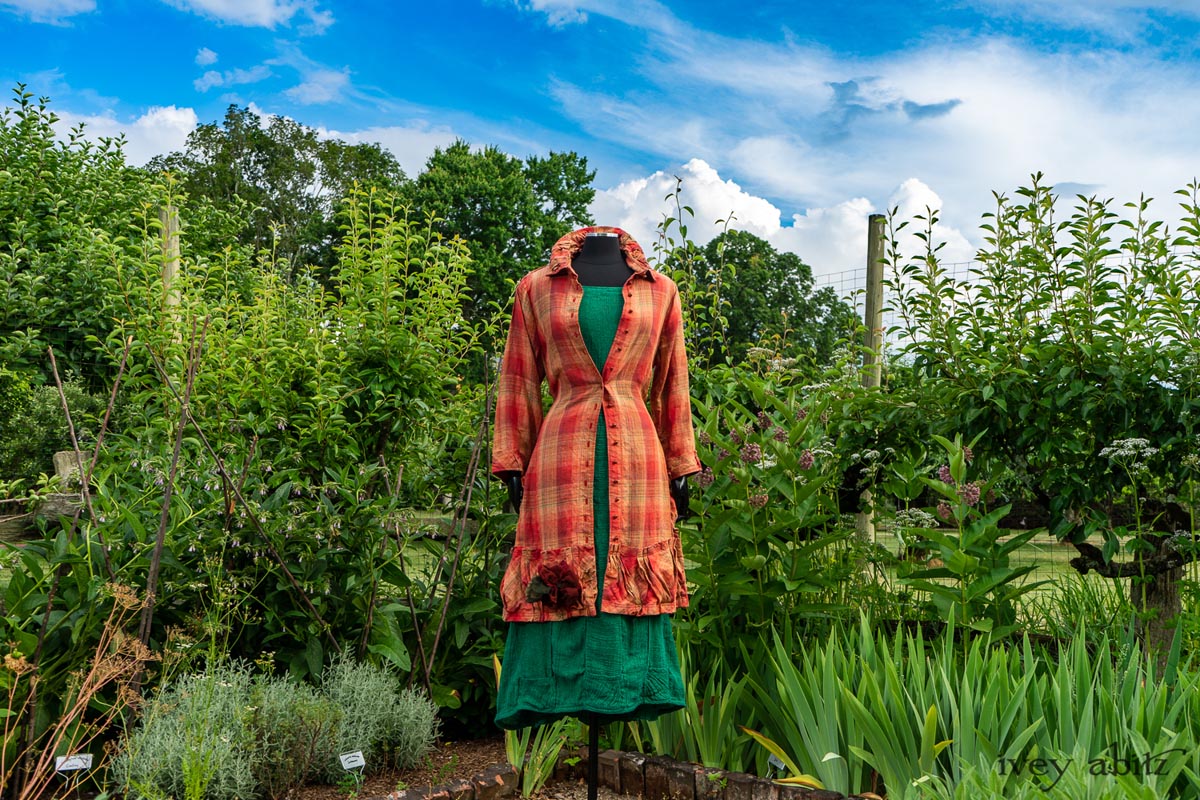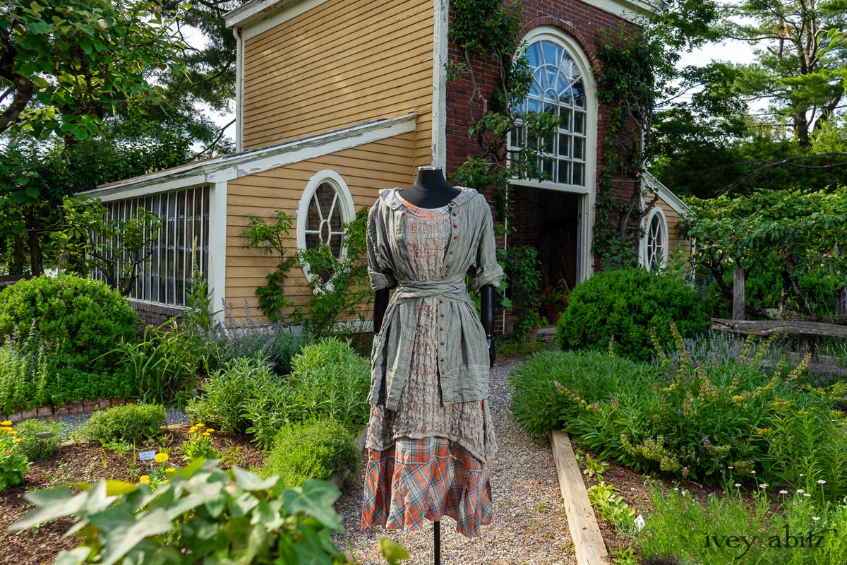 Gabled Duster Coat in Sunnyside Washed Plaid; Campanella Frock in Gracious Green Washed Crinkled Linen; Idyll Brooch in Rose Garden Silk Weaves. Ivey Abitz at Boscobel House and Gardens
