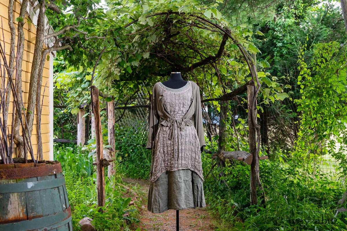 Chevallier Cardigan in Herb Garden Soft Ribbed Knit; River Frock in Natural Plaid Open Weave; Hudson Frock in Herb Garden Washed Linen. Ivey Abitz at Boscobel House and Gardens